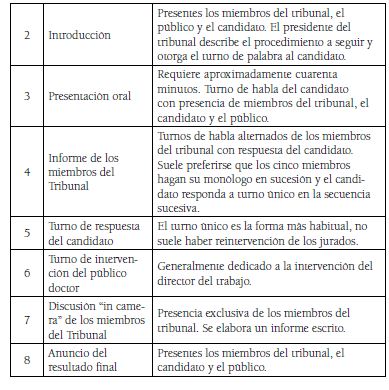 La macroestructura general de la DTD ha sido descrita en otras investigaciones y presenta las divergencias típicas de las diferentes tradiciones académicas. En Canadá, por ejemplo, esta macroestructura se presenta en cinco pasos (Chen 2008, p. 14): pre-defensa, presentación del candidato, turno de preguntas, discusión “in camera” de los miembros del tribunal y anuncio del resultado final. En el ámbito de los Estados Unidos (EU) y, según describen Grimshaw et al. (1994) y Swales (2004), la secuencia de partes es similar:
