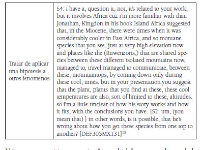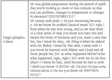 Nótese que no existen preguntas “rompehielo”, como es el caso de la justificación del objeto de la investigación, que no se realiza en ninguna de las DTD del corpus MICASE. No existe necesariamente una pregunta clásica de apertura, fuera del término de la presentación y el turno de palabra del presidente. No existe, tampoco, un movimiento desde la concreción de los aspectos incluidos en la tesis a aspectos generales que pueden abstraerse como conclusiones, sino solo una secuencia de turnos en la que cada miembro del tribunal hace comentarios y no solo preguntas y en la que, frecuentemente, hay superposición de turnos, cortes y respuestas del público como risas (la más frecuente), monosílabos afirmativos o negativos o aplausos.