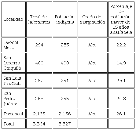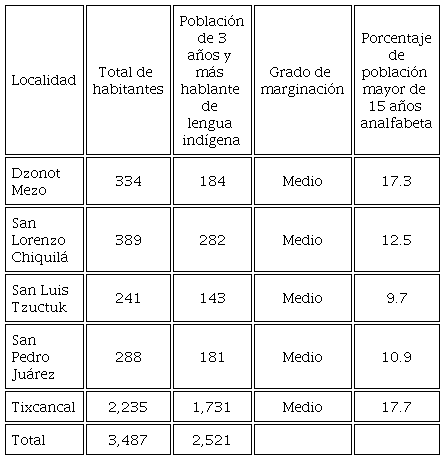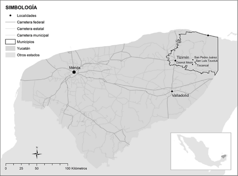 Estudiamos 5 localidades (Tablas 1 y 2) del municipio de Tizimín, en el oriente de Yucatán, cercanamente ubicadas (Mapa 1). Según el último Censo de Población y Vivienda (INEGI, 2020), en estas localidades vive un total de 3,487 personas, de las cuales 2,521 eran hablantes de lengua indígena, que representaba al 72.3% de la población. Es decir, por el criterio lingüístico este municipio es predominantemente maya, a lo que añadimos otros indicadores de identidad, como los rituales de tradición maya, el sistema familiar de tipo mesoamericano, la auto-identificación, entre otros.
