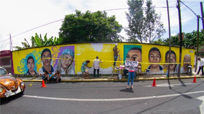 El primer mural que realizaron en conjunto Aldo Daniel Hernández y el colectivo se pintó en las calles Oriente 5 y Norte 38 de la ciudad de Orizaba. Dos personas que han apoyado al colectivo, prácticamente desde su origen, ofrecieron dos bardas de su propiedad para que se plasmaran los primeros rostros de algunas de las personas desaparecidas. Una de las propietarias comentaba en aquel momento para los medios de comunicación que no dudó en sumarme al proyecto, porque era importante que la población estuviera consciente de que en Orizaba estaban desapareciendo personas (León, 2016). Dicho espacio es emblemático porque en un perímetro de 500 metros se suscitaron diversos eventos que dejaron un saldo de, por lo menos, tres asesinatos y un secuestro (León, 2016). A cuatro calles de donde actualmente se encuentra el mural, en el centro nocturno Pitbull, Fernanda Rubí, hija de Aracely Salcedo, fue privada de su libertad el 7 de septiembre de 2012; cuatro años después, en ese mismo lugar, Víctor Osorio Santa Cruz, alias “el Pantera” fue asesinado junto a otras personas; de igual manera, en el antro Shine, no muy lejos de ahí, en septiembre de 2016 otros seis jóvenes fueron atacados a balazos y uno de ellos murió; es por ello que, en dicho contexto marcado por la violencia, resulta bastante significativa la intención de apropiarse de ese espacio y resinificarlo con imágenes de jóvenes desaparecidos (Del Palacio y Torres, 2020, p. 210-211).