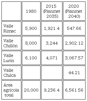 La Tabla 1 muestra el impacto de la expansión urbana en la provincia de Lima sobre la superficie agrícola. De acuerdo al frustrado Plan de Desarrollo de Lima (PLAM 2035), el cual no llegaría aprobarse por la Municipalidad, entre 1980 y el 2015 el suelo agrícola había disminuido en un 50%, pasando de 20,000 hectáreas a unas 9,237.63 has (Municipalidad Metropolitana de Lima, MML, 2015, p. 403). En ese lapso, el valle del río Rímac había pasado de 5,900 has. a 1,921.4 has, el valle del Chillón de 8,000 a 3,244 has y el valle de Lurín de 6,100 hectáreas intangibles a 4,071. En los estudios recientes del PLANMET 2040, se consigna un suelo agrícola menor, de 6,651.56 recibirían presión urbana (MML, 2021).2