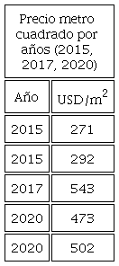 En cuanto a los submercados de lotizaciones informales, existen diferencias en los precios. Mientras que en Chacarilla del Norte el m2 por lotes de 90 m2 está entre 502 y 514 USD/ m2, en “Lagos”, ubicado a solo 400 metros de distancia, el m2 cuesta 400 USD (Tabla 4), siendo que se trata de un emprendimiento nuevo que no cuenta con la plusvalía urbana obtenida por Chacarilla (en su tercera etapa) y se trata de un terreno que fue usado industrialmente (ladrillera).
