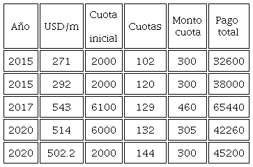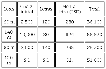 La segunda etapa se inició en el 2017, siendo que un comprador pagó 6,100 USD de inicial por un lote de 120 m2 y 129 cuotas mensuales (casi 11 años) de 460 USD, lo cual arrojaba un costo total de 65,440 USD (545.3 USD/m2), casi el doble de lo ofertado dos años antes. Para entonces, la cuota inicial se había multiplicado por tres y las cuotas mensuales fijas subieron a 460 USD. La tercera etapa (2020), en la coyuntura de la pandemia COVID 19, muestra un comprador que pagó por un lote de 90 m2 unos 6,000 USD de inicial, con 132 cuotas de 305 USD, lo cual arrojaba un costo total de 42,260 USD (473 USD/m2). Una compradora pagó por un lote de 90 m2 una inicial de 2,000 USD (había bajado) y 144 letras de 300 USD, con lo cual el costo total salía a 45,200 USD (502 USD/m2).3