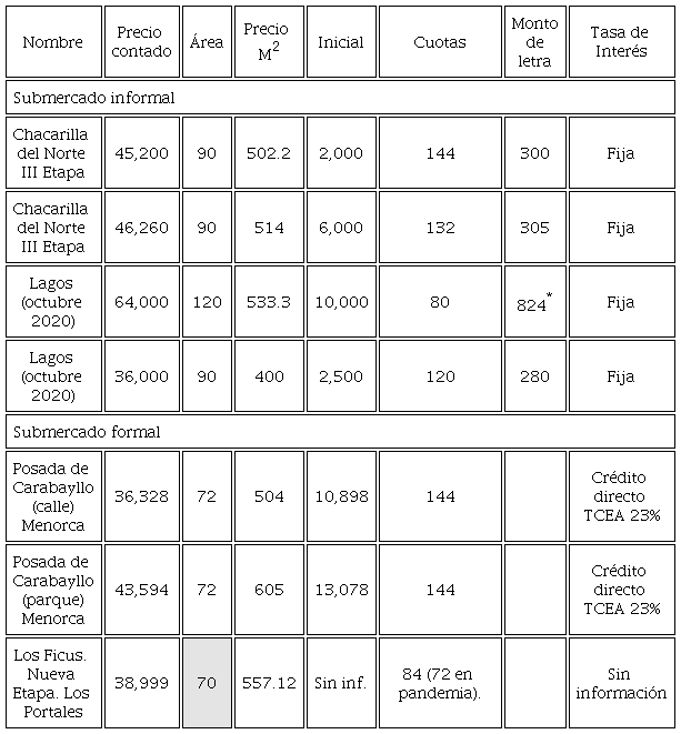El hecho que en el distrito de Carabayllo existan submercados formales e ilegales (“informales”) permite establecer una comparación. Se consideró fraccionamientos sobre suelo agrícola, ubicación y accesos parecidos (altura del km 30 o 32 de la Panamericana Norte) y naturaleza plana. En cuanto a los submercados de lotizaciones informales, a unos 400 metros de Chacarilla del Norte en tiempos de pandemia ha surgido un fraccionamiento denominado programa “Lagos”, una sociedad entre el propietario agrícola y la empresa inmobiliaria “Santa María S.R. Ltda”. Se oferta un terreno que antes se utilizaba para la reventa de ladrillos fallados, provenientes de una ladrillera aledaña. Como la zona se encontraba a desnivel, tuvo que “rellenarse” el suelo, una deficiencia advertida por la misma empresa. Al 2021 contaba con solo una vivienda ocupada. En cuanto al submercado de lotizaciones formales, se ha considerado a la urbanización Posada de Carabayllo y los Ficus Nueva Etapa.