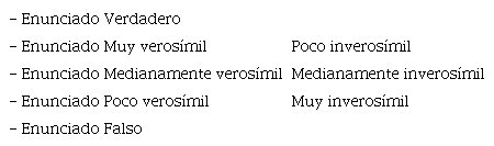 Es claro que la definición de verosimilitud requiere una definición previa de verdad, y esto revela la primacía de la verdad respecto de la verosimilitud (Roetti, 2014, p. 52). Y es así porque mientras que verdadero y falso son contradictorios absolutos para la mayoría de los sistemas lógicos,4 no ocurre lo mismo con los enunciados verosímiles o inverosímiles, porque la verosimilitud y la inverosimilitud tienen grados, algunos muy próximos a la verdad o a la falsedad, otros más alejados. Podemos entonces establecer esta tabla donde el primero y el último ítem determinan contradicción, y las formas segunda y cuarta son contrarias entre sí y la tercera son equivalencias: