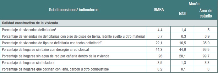 En relación con la calidad constructiva de la vivienda, datos del último Censo (Instituto Nacional de Estadística y Censos, 2010) muestran que en el área de estudio la presencia de viviendas de tipo deficitario (ranchos, casillas, piezas, etc.), así como de viviendas que, sin ser deficitarias por su tipo, tienen techos o pisos que pueden afectar a la salud y la calidad de vida, tienen un peso relativo significativamente más alto que en el conjunto de Morón, dando cuenta de que se trata de un área particularmente deficitaria en este sentido dentro del municipio. Así, en el barrio analizado, el 5% de las viviendas son deficitarias por su tipo —situación que en el conjunto de Morón es del 1,4%—; y entre las viviendas no deficitarias (casas y departamentos) casi el 1% tiene pisos de tierra, ladrillo suelto u otro material y un 35,9% presentan déficits vinculados a la calidad de los techos, por carecer de cielorraso o estar hechas de materiales que no permiten una adecuada protección del ambiente, situación mucho más desfavorable que la que presenta el total del municipio, e incluso la RMBA en su conjunto (tabla 1).
