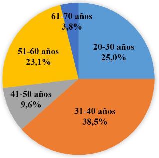 Con el estudio realizado se pudo identificar que de las personas encuestadas, el 61,5% correspondió a mujeres y el 38,5%, a hombres, los cuales comprendían edades entre los 20 a los 64 años (figura 1).
