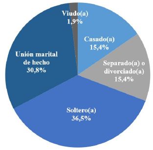 En cuanto al estado conyugal actual, el mayor porcentaje de vendedores corresponde a solteros, seguido de personas que viven en unión marital de hecho mayor a dos años. En igual porcentaje se encontraron personas casadas y separadas o divorciadas, y un pequeño porcentaje corresponde a personas viudas (figura 2).