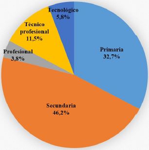 Desde el punto de formación académica se pudo evidenciar que el mayor nivel educativo alcanzado de los encuestados es la secundaria, con un 46,2%; seguido por primaria, con un 32,7%. En menor proporción se presentaron personas que alcanzaron el nivel técnico profesional, tecnológico y profesional (figura 3).