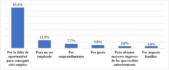 Al indagar sobre las motivaciones que llevan a las personas a laborar en este tipo de negocios, el mayor porcentaje de la población de estudio, correspondiente al 65,4%, manifestó hacerlo por la falta de oportunidad para conseguir otro empleo, seguido, en menor porcentaje, por motivaciones como el no ser empleados, por emprendimiento o por gusto, entre otras (figura 5).