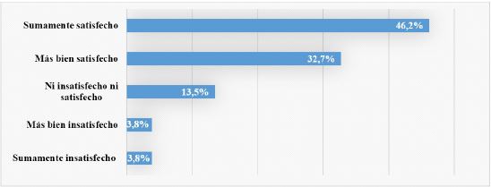 Cuando se les preguntó a los entrevistados, ¿en qué medida está usted satisfecho con su trabajo de venta de alimentos?, la mayoría informó estar sumamente satisfecho, seguido de más bien satisfecho, como lo muestra la figura 6. También se logró determinar que el 61,5% está interesado en cambiar de empleo, mientras que el 38,5%, manifestó no estarlo.