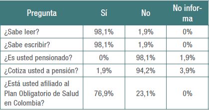 En la tabla 1 se muestran las respuestas a las preguntas relacionadas con el alfabetismo y la afiliación al Sistema General de Pensiones y al Plan Obligatorio de Salud (POS) en Colombia.