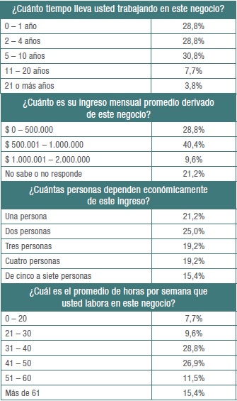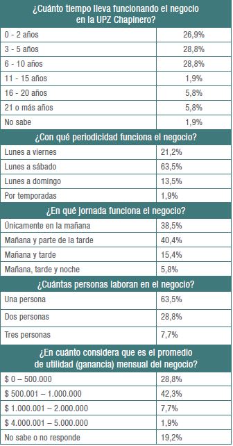 Adicional a la caracterización de los vendedores de alimentos, se quiso conocer más acerca de los negocios donde laboran estas personas, por lo que se incluyeron algunas preguntas al respecto, con las cuales se pudo establecer que la mayoría de los negocios llevan menos de 10 años funcionando en la UPZ Chapinero, brindando sus servicios principalmente de lunes a sábados en horas de la mañana y parte de la tarde (hasta las 4:00 p.m.), trabajando de una a tres personas por negocio y teniendo como utilidad mensual menos de un millón de pesos colombianos (COP) (tabla 4).