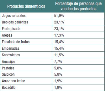 De acuerdo con los resultados de las entrevistas, el producto que más venden las personas entrevistadas son los jugos naturales, lo cual requiere la selección y manipulación de las frutas, agua y demás ingredientes que necesitan para su elaboración. En cuanto a este tema, es importante considerar la resolución 604 del Ministerio de Salud (1993), que aunque rige únicamente para venta de alimentos de tipo formal, lo ideal es que los vendedores de alimentos cumplan con las condiciones sanitarias mínimas para garantizar un producto de calidad, dada la manipulación que hacen de los alimentos que preparan y venden. Uno de los artículos incluidos en dicha resolución indica que los manipuladores o vendedores de alimentos deben capacitarse en manipulación higiénica de alimentos (Resolución 604, 1993), al respecto, más del 40% de los entrevistados mencionaron no haber participado en capacitaciones que le sirvan para desempeñarse en la preparación, manipulación y/o venta de alimentos, lo que hace pensar en las condiciones bajo las cuales se preparan las comidas y en las falencias que puedan tener los vendedores a la hora de entregar un producto apto para el consumo humano.