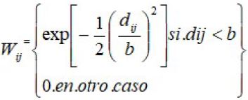 En donde W (ui, vi) es la matriz de pesos espaciales de dimensión (nxn) de la observación correspondiente a las coordenadas (ui,vi). Las componentes Wi,j de dicha matriz son calculadas a partir de una función Kernel, en este caso a partir de la función gaussiana, que asigna una mayor ponderación a las observaciones más cercanas: