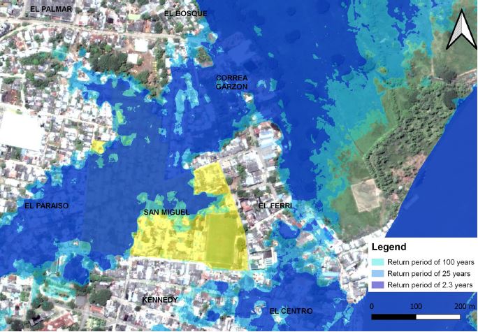 En la figura 1 es posible observar la localización y configuración barrial de San Miguel y, al mismo tiempo, las zonificaciones de inundación para periodos de retorno de 2,3, 25 y 100 años, las cuales se convierten en insumos de vital importancia para la integración del conocimiento de autoridades locales y sus comunidades, pues ayudan a evidenciar la situación actual y a ampliar la información que se posee a nivel local, de lo que se ha hecho, se puede hacer y se debe hacer para prevenir la ocurrencia de nuevas inundaciones o para tener respuestas más eficaces con fines de evaluación integral del riesgo: ordenamiento territorial y planeación física y escenarios de respuesta a las emergencias (Institución Universitaria Colegio Mayor de Antioquia y Universidad Nacional de Colombia, 2016).