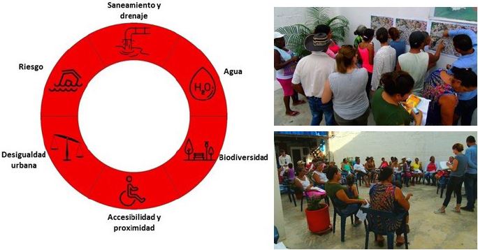Fase C. Priorización: se realizó un proceso participativo de evaluación de la calidad de vida urbana y de identificación de prioridades, esto se hizo desde un enfoque interdisciplinar donde participaron investigadores de diferentes disciplinas: arquitectura, ingeniería civil, ingeniería ambiental y planeación y desarrollo social. De igual forma, se continuó el trabajo de campo iniciado en la Fase A, apoyado en el método etnográfico y transectos con el fin de entender las problemáticas (ambientales, urbanas, sociales y de gobernanza) del territorio ocasionadas por la inundación. Una vez sistematizada la información documental y los datos obtenidos en el campo; se procedió a agrupar la información en categorías, estableciendo relaciones entre los conceptos, priorizando así los temas que conforman los pilares que fueron tomados en cuenta para la elaboración del plan de acción desde estrategias organizativas, estructurales, institucionales y culturales para el MIB. Para ilustrar el resultado de la priorización identificada, se recurrió a un ejercicio semáforo (figura 2).
