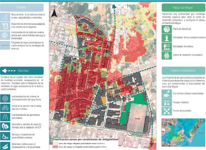 Fueron empleadas acciones encaminadas a identificar las áreas de oportunidad dentro del barrio para la implementación de intervenciones en materia de infraestructura para el mejoramiento del espacio público, con ejes de accesibilidad y movilidad sostenible. Para esto, se intervinieron los aspectos físicos del territorio en función de las dimensiones de vivienda (por medio del mejoramiento de viviendas, desarrollo de nuevas residencias, se plantearon sistemas sostenibles de agua y electricidad, etc.), movilidad (implementando sistemas de direccionamiento de agua lluvia, mejoramiento de infraestructura vial para ciclistas, construcción de pavimentos permeables, etc.), espacio multipropósito (correspondiente a eco-huertas urbanas, parques infantiles y puntos de encuentro), y el Parque San Miguel (por medio de la ampliación de la oferta de servicios institucionales como prácticas deportivas, actividades físicas, formativas, y el centro de desarrollo comunitario). En la figura 5 Se puede observar la localización de estas intervenciones con respecto a las zonas identificadas como mitigables y no mitigables después de la evaluación de riesgo por inundación (Rodríguez-Gaviria, 2016).