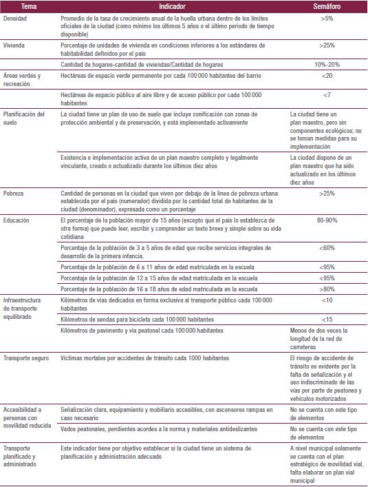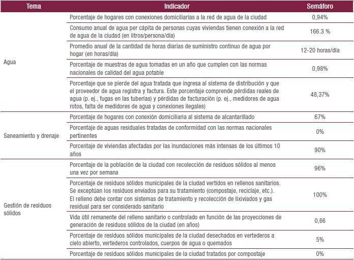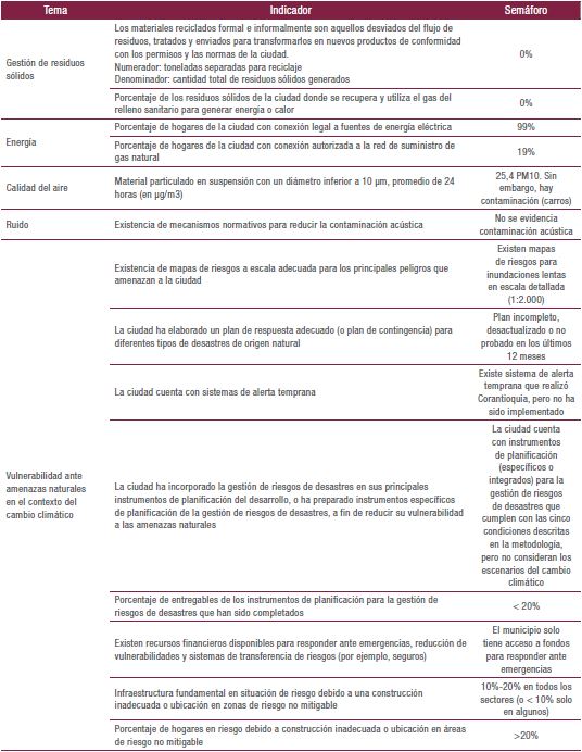 A continuación (tablas 1, 2 y 3), se muestra el estado, según el ejercicio semáforo, de los indicadores en el barrio San Miguel desde cada una de las dimensiones de la sostenibilidad, tomando como valores de referencia los datos suministrados por la Guía Metodológica de la Iniciativa de Ciudades Emergentes y Sostenibles del Banco Interamericano de Desarrollo (2014):