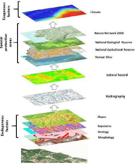 The primary assumption providing the grounds for this approachis the existence of two sets of structuring factors providing physical support to planning (Cordeiro, 2017): “endogenous” (directly or indirectly associated with the morphological structure) —geomorphology; geology/lithology; tectonics (and seismicity); slopes declivity and their exposures; morphometry of slopes and drainage basins; soil structure— and “exogenous” (climate-related), such as radiation, temperature, wind, and rain, inter alia. It seems clear that the other factors constituting the natural constraints on urbanism and land-use planning are, to a lesser or greater degree, tied to the interconnection between these two structural factors (figure 1).