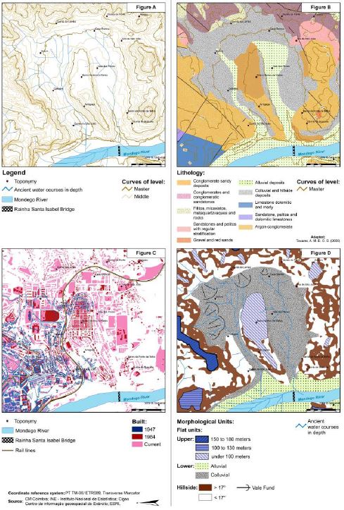 The analysis of the physical supports, and in this particular case those of the morphological system —geomorphology/geology/lithology/ tectonics, as well as those associated with them, such as the declivitys, the exposures of the slopes, and even the materials of alteration or the soils— were described and interpreted from an interdisciplinary point of view and with analyses different from those carried out in the disciplinary (or even multidisciplinary) approaches. Taking the historical evolution of the city of Coimbra as an example, we took as crucial pieces its urban settlements, which developed in very different historic (and technological) contexts during their long relationship with the morphological system, making it possible to map out and realign some of the analyses of the city territory carried out previously. In reality, physical geography conditioned the development of Coimbra’s urban design over the time. In harmony during a millennium, but in disruption due to the existent real estate pressures during the last six decades.