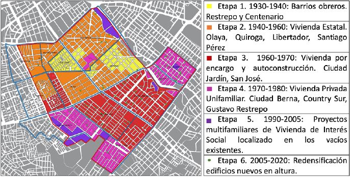 La historia del Restrepo y de los sectores aledaños1 comienza con los primeros barrios, llamados “obreros”, el Restrepo y el Centenario, que surgieron en los años 30 por iniciativa estatal, para solucionar problemas higiénicos en el centro histórico (Pulgarín, 2009). Entre los años cuarenta y cincuenta, cuando se aceleró el crecimiento urbano y la migración hacia la ciudad, surgieron otros barrios de vivienda estatal como el Olaya, el Quiroga, el Libertador y el Santiago Pérez (Colón y Mejía, 2019). En los años sesenta y setenta, se desarrollaron urbanizaciones privadas, cuyas viviendas se construyeron por encargo (Ciudad Jardín) al lado de algunos barrios de origen popular desarrollados por autoconstrucción (San José y Sosiego Sur). Hacia final de la década del setenta, algunas constructoras y entidades financieras promovieron viviendas unifamiliares para funcionarios públicos en barrios como: el Country Sur y Gustavo Restrepo. Finalizada la década del noventa y a principios de los 2000, con las nuevas políticas de vivienda de interés social, se construyeron proyectos multifamiliares sobre los terrenos vacíos que aún quedaban disponibles.