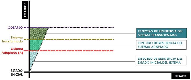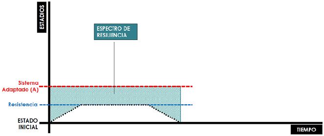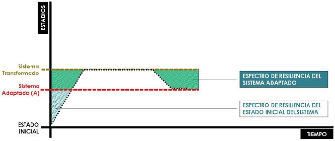 Tal y como se muestra en las figuras 2 y 3, el espectro de resiliencia que subyace en un sistema adaptado o en proceso de adaptación es completamente diferente al que se da en el estado inicial.