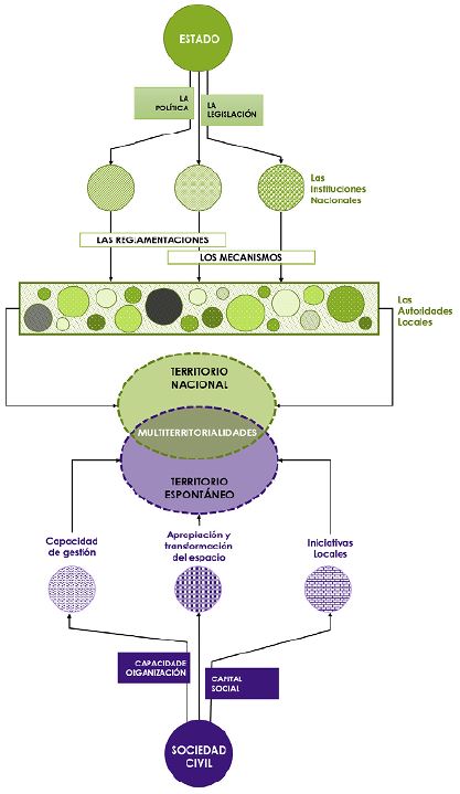 De otro lado, y además de los elementos propios y constitutivos del sistema territorial antes mencionados, se tiene la necesidad de entender la naturaleza de las relaciones que se dan entre las comunidades, el espacio y los actores institucionales y/o similares que influyen en la estabilidad de ese sistema territorial. Es por esto que se planteó un modelo conceptual que permitiera entender e identificar las diferentes relaciones que existen entre estos actores, y los escenarios de poder e influencia con los que cuenta cada uno de ellos en la construcción o conformación del territorio, para así poder determinar, en el constructo general de la gestión, los desafíos que deben ser superados para facilitar escenarios de participación y toma horizontal de decisiones (figura 5).