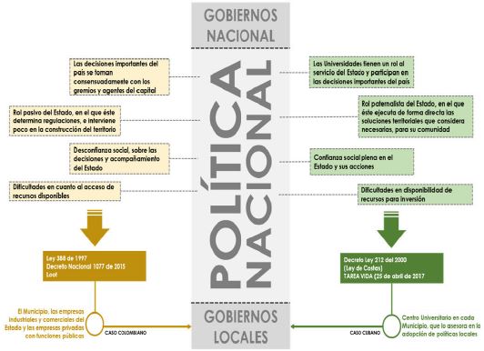 En Cuba, esta relación entre el Gobierno y los ciudadanos se da de forma directa, o a través de la academia, mientras que en Colombia, se da a través de los mecanismos de participación o socialización determinados en la ley para la ejecución de proyectos, la construcción de planes de desarrollo, etc.