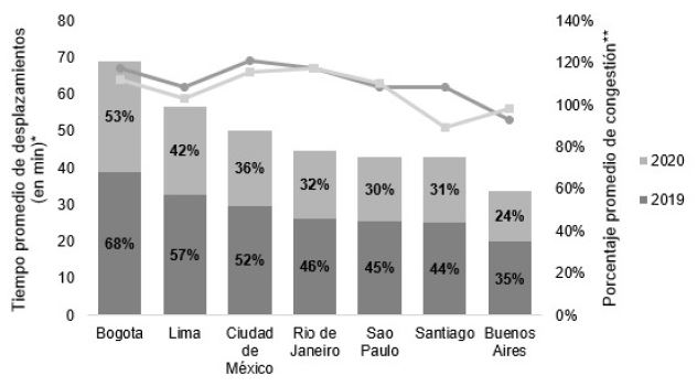 Según datos de Moovit y TomTom (figura 1), para los años de 2019 y 2020, en las principales ciudades de Latinoamérica sigue siendo elevado el tiempo de desplazamientos y el porcentaje de congestión.