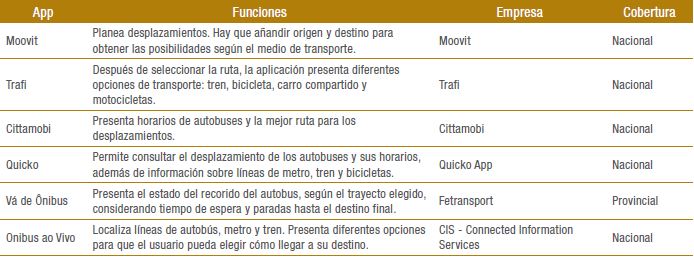 Las aplicaciones móviles (app) son sistemas inteligentes que integran los datos sobre movilidad urbana (Barceló-Ugarte et al., 2017; Sabino et al., 2020). Para utilizar una aplicación es necesario tener un smartphone, lo cual de cierta manera puede limitar su uso en algunos grupos poblacionales, pero, en general, tiene amplia penetración social. En la tabla 1 se señalan las aplicaciones con más de 100.000 instalaciones, y que aportan información sobre diferentes medios masivos de transporte.