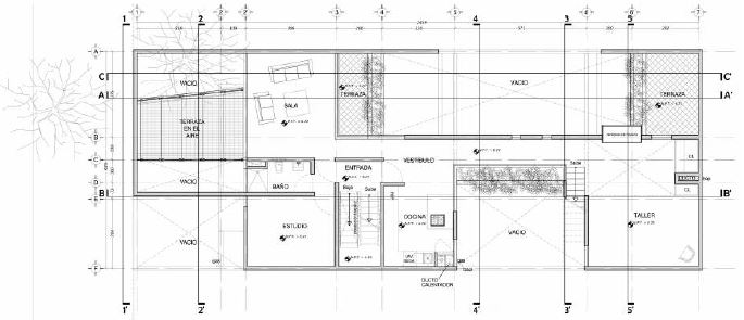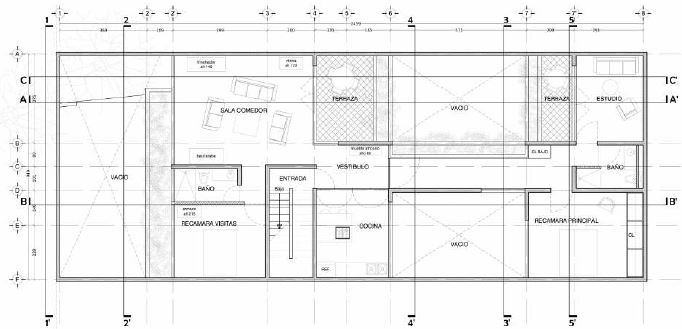 Un elemento de socioeficiencia importante fue la terraza, hecha de rejilla para permitir el flujo de la luz al departamento inferior, el de la madre, quien no quería que la incorporación de un nuevo nivel fuera en detrimento de la luz que recibiría en el suyo. Para conseguir el equilibrio entre los requerimientos de los dos usuarios (los arquitectos se enfrentaron a una situación en la que había un cliente económico, el hijo, y un cliente emocional, la madre) hubo que trabajar la volumetría del segundo nivel. Con un techo inclinado, se pudo reducir la altura para que el ángulo del sol estuviera lo más aprovechado posible; además, la jardinera del último nivel se pensó con un retrancamiento hacia el interior, que permitió dar más aire al patio. Por consiguiente, la verticalización (tema central en el proceso de densificación que sufre la ciudad, donde cada generación suele añadir niveles a la casa de la generación anterior) se llevó a cabo de una manera muy cuidada, buscando que los espacios fueran satisfactorios para todos, lo cual redundaría en una cohabitación eficiente.