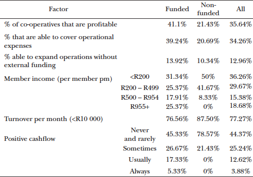 From the table, it is clear that the funding had a positive effect on the financial position of individual worker co-operatives; however, even after receiving on average R770,453 (US$59,266) per worker co-operative in funding, more than 60% of the supported co-operatives still remained unable to cover their operating expenses. More than 86% were unable to expand operations without additional funding; furthermore, 74.63% remained unable to pay members an adequate income while most of them still realised an infrequent positive cash flow.