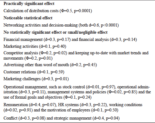 Phi-coefficients were calculated in order to determine if there were practically significant relationships between relative success and certain conditions and practices in the worker co-operatives in the study. In view of the fact that the research did not involve random sampling, interpretation of comparisons between the various groups’ means was done by using Cohen’s effect size (d) (Cohen, 1988). Effect sizes were discussed indicating practical significance where the difference was large enough to have an effect in practice (Steyn, 2009). Moreover, interpretations of the practical significance of effects were done by using the phi-coefficient and Pearson correlation coefficient as effect sizes. The guidelines utilised for d-values regarding differences between means are |0.3| for a small effect, |0.5| for a medium effect (noticeable with the naked eye), and d ≥ |0.8| for a large effect (practically significant).