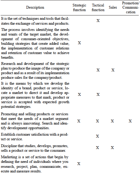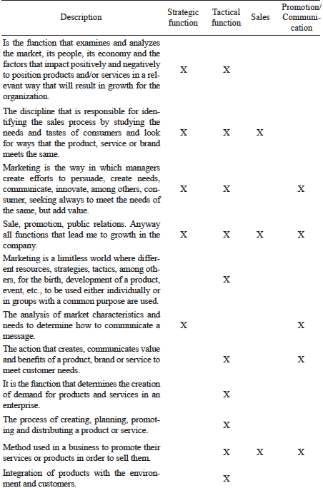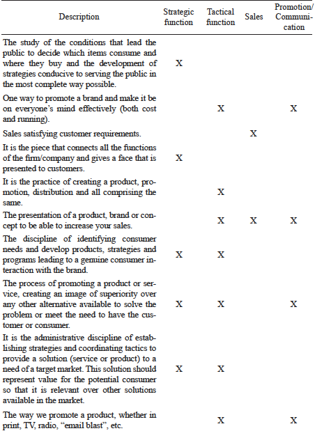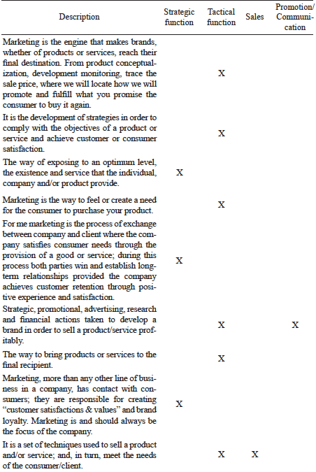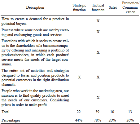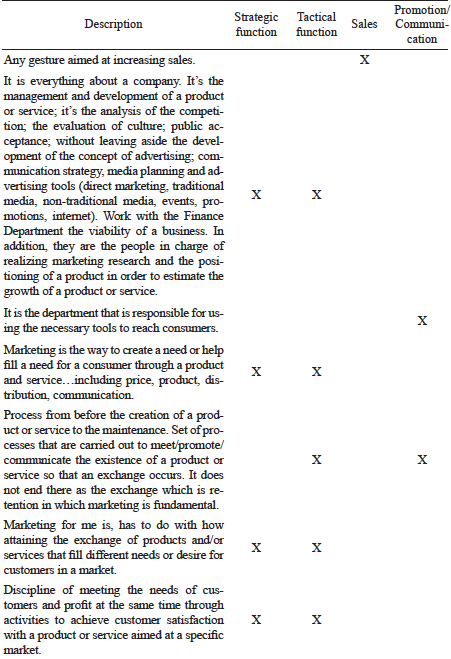 The sample of managers (marketing managers, marketing directors, vice-presidents of marketing, vice-presidents of sales and marketing, etc.) that accessed the link to participate in the study was of 69 people; however, after eliminating 19 samples from survey because of incomplete responses, the final sample size was of 50 marketing managers. Content analysis allowed the researchers to analyze the 50 responses of the open-ended question about how marketing is defined by marketing managers. The Appendix lists the definitions that marketing managers provided2 (referring to Research Question 1). All 50 definitions provided by marketing managers were analyzed using the four constructs—strategic function, tactical function, sales and promotions/communications.