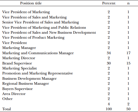 Participants were also asked to provide the “name” for the position they held within the company. In this study, 19 different titles for managers that carry out marketing functions were identified. Table 1 delineates the variety of titles that the person in charge of marketing held and the number of participants that held each of those titles.