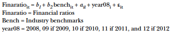 In previous studies as Bayney (2005), Collins-Fulea, Mohr, and Tillett (2005), Ellershaw, Gambles, and McGlinchey (2008), Meissner, Mescha, Rothaug, Zwacka, Gottermann, Ulrich, and Schleppers (2008) they do not validate or compare the industry benchmark with financial ratios. To date, no systematic investigation has considered this perspective; our study is the first to evaluate this combination of ratios, dimension and industry benchmark.