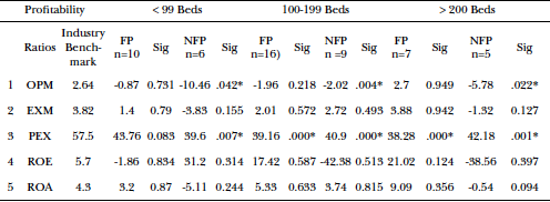 Table 9 provides us the descriptive statistics and results of the financial ratios, using the one sample t-test to validate the industry benchmark in the three categories of profit and nonprofit hospitals in the dimension of profitability. To test our hypothesis, we ran an analysis in all the control variables belonging to this dimension.