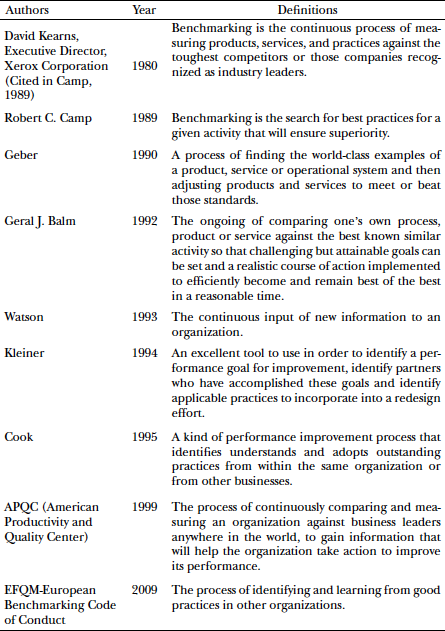 As the concept of benchmarking evolved, other researchers, such as Vaziri (1992), Watson (1993), and Kleiner (1994) support the definition that benchmarking is an excellent tool used to identify a target for improving organizational performance, partners who have achieved these goals and practices that are applicable to incorporate an effort to redesign or restructure the company. They agree that benchmarking is a continuous input of new information to an organization and its three most important principles are: (a) the maintenance of quality, (b) customer satisfaction, and (c) continuous improvement. The concept of benchmarking has changed over the time; has multiplied and diversified its definitions, which are found mainly in the industrial sector as we see in Table 1.