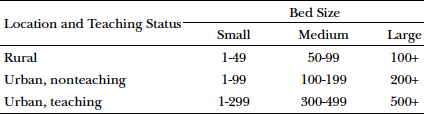 In Puerto Rico, according to the hospital profile data of the AHD, all the hospitals are listed as urban, nonteaching hospitals; therefore, we use the classification of the groups in accordance with NIS bed size categories: small (less than 99 beds), medium (100-199 beds), and large (more than 200 beds) (AHD, 2012).