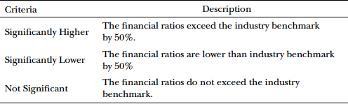 In this study, we are focused on validating whether the financial industry benchmark differs or not from a group of selected financial ratios of for profit and nonprofit hospitals, to determine if their financial performance is an efficient or inefficient one in the healthcare system of Puerto Rico. In each category of hospitals (< 99, 100-199, and > 200 beds), we compare whether or not the averages of the variables of the two types of hospitals are equivalent or significantly differ from the industry benchmark and establish whether or not the difference is significantly lower, significantly higher, or not so significant at all. To establish these differences, we use the following researcher criteria, as set forth in Table 3.