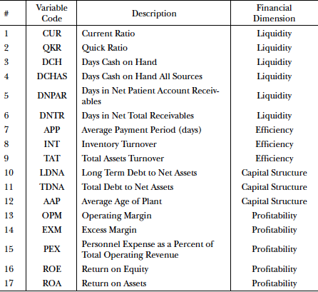 The dependent variable is going to be measured as follows: we compare the 17 financial ratios, with the industry benchmark separated into the three categories (< 99, 100-199, and > 200 beds); then, we point out those that are greater or equal than the industry benchmark, taking in consideration the above criteria. Second, we point out those that were lower than the industry benchmark, also taking into consideration the above criteria. When all is identified, we calculate the percentage (of the total of 17 financial ratios) for the first group and the second group. This is going to be performed to for profit and nonprofit hospitals. The criterion used was: if 50% or more of the total of financial ratios are greater or equal than the industry benchmark this is classified as efficient performance. This means that the financial activity of the hospital meets the financial needs of the organization in comparison to the best in class of the industry. Otherwise, if fewer than 50% of the total financial ratios are greater or equal than the industry benchmark, this is classified as inefficient performance. This means that the financial activity of the hospital does not meet the financial needs of the organization in comparison to the best in class of the industry. The independent variables are the 17 financial ratios classified by dimension and obtained from the AHD website, which is show in Table 4: