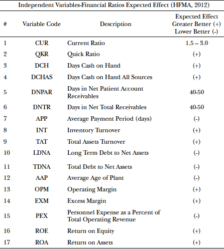We also take into consideration the criteria or the Expected Effect established by the HFMA (2012) when evaluating the financial ratios. Our study uses this evaluation metric because the HFMA is the most important organization in the United States, with more than 40,000 nationwide memberships. This organization builds and supports other healthcare associations and industry groups, to achieve consensus on the solutions needed for the challenges facing the healthcare system today. This association identifies gaps throughout the healthcare system and is the bridge and link for the creation and exchange of knowledge and best practices in the system.