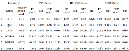 Table 6 provides the descriptive statistics and results of the financial ratios using the one sample t-test, to validate the industry benchmark in the three categories of for profit and nonprofit hospitals (< 99, 100-199, > 200 beds), in the dimension of liquidity. To test our hypothesis, we ran an analysis in all the control variables belonging to this dimension.