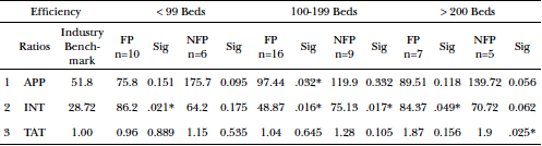 As we see in Table 7, in the dimension of efficiency, the majority of the financial ratios in all the categories gets a significance level (2-tailed) greater than 0.05; therefore, the financial performance in these ratios does not differ significantly from the industry benchmark. The exception was in the financial ratio of Inventory Turn Over (INT) of for profit hospitals. As we see in Table 7, the financial ratios of < 99 beds (M = 86.2, p = .021), between 100-199 beds (M = 48.87, p = .016), and > 200 beds (M = 84.37, p = .049) get a significance level (2-tailed) of less than 0.05. They were greater than the industry benchmark, which were 28.72. Concurring with the proposed hypothesis, the financial performance for these financial ratios differs significantly from the industry benchmark; consequently, we rejected the null hypothesis.