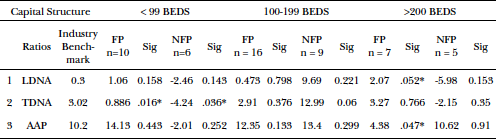 Table 8 provides the descriptive statistics and results of the financial ratios using the one sample t-test, to validate the industry benchmark in the three categories of for profit and nonprofit hospitals, in the dimension of capital structure. To test our hypothesis, we ran an analysis in all the control variables belonging to this dimension.