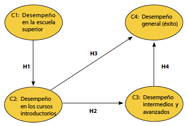 H3: C2 → C4, el desempeño en los cursos introductorios universitarios influye positivamente en el desempeño general (éxito)