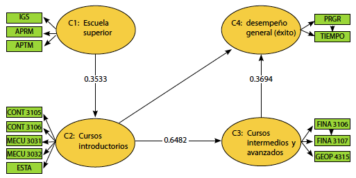 H4: C3 → C4, el desempeño en los cursos intermedios y avanzados universitarios influye positivamente en el desempeño general (éxito)