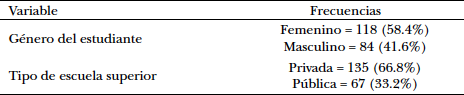 En el estudio participaron 118 estudiantes del género femenino y 84 estudiantes del género masculino. Del total de estudiantes, 135 provenían de escuelas privadas y 67 de escuelas públicas, como lo ilustra la Tabla 1.