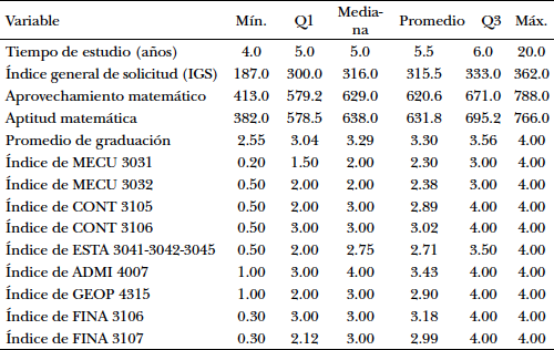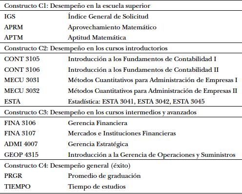 Se analizaron las variables: aprovechamiento y aptitud en matemática en la Prueba de Evaluación y Admisión Universitaria, género del estudiante, tipo de escuela (pública o privada), IGS, índice de notas de los cursos cuantitativos, promedio de graduación y tiempo de estudio (en años). Para realizar el análisis de los datos se consideraron las notas de los estudiantes en cursos medulares de naturaleza cuantitativa que ofrece la FAE; específicamente, se analizaron las notas de los siguientes cursos: Métodos Cuantitativos para Administración de Empresas I y II (MECU 3031), Métodos Cuantitativos para Administración de Empresas II (MECU 3032), Estadística para Administración de Empresas I (ESTA 3041), Estadística para Administración de Empresas II (ESTA 3042), Introducción a la Estadística para la Administración de Empresas (ESTA 3045), Introducción a los Fundamentos de Contabilidad I (CONT 3105), Introducción a los Fundamentos de Contabilidad II (CONT 3106), Mercados e Instituciones Financieras (FINA 3107), Gerencia Financiera (FINA 3106), Introducción a la Gerencia de Operaciones y Suministros (GEOP 4315) y Gerencia Estratégica (ADMI 4007).